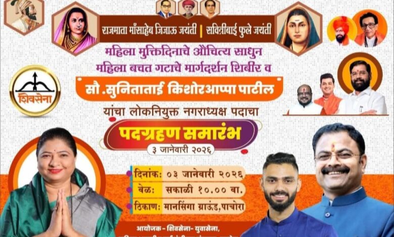 पाचोरा – राजमाता जिजाऊ जयंती, सावित्रीबाई फुले जयंती आणि महिला मुक्तिदिनाच्या प्रेरणादायी पार्श्वभूमीवर पाचोरा शहरात सामाजिक व राजकीय परिवर्तनाचा नवा अध्याय उद्या लिहिला जाणार आहे. शिवसेनेच्या नेत्या तथा पाचोरा नगरपरिषदेच्या लोकनियुक्त नगराध्यक्ष सौ. सुनीताताई किशोर (आप्पा) पाटील यांच्या नगराध्यक्षपदाचा पदग्रहण सोहळा उद्या मोठ्या उत्साहात पार पडणार आहे.